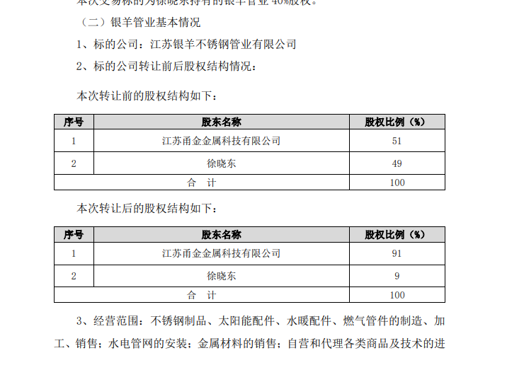 為更好管理和拓展公司不銹鋼水管業(yè)務(wù),浙江甬金金屬科技股份有限公司全資子公司江蘇甬金金屬科技有限公司與江蘇銀羊不銹鋼管業(yè)有限公司少數(shù)股東徐曉東先生于近日簽署了《股權(quán)收購協(xié)議》,公司決定以 7,975 萬元的價格收購徐曉東先生所持 銀羊管業(yè) 40%的股權(quán)。