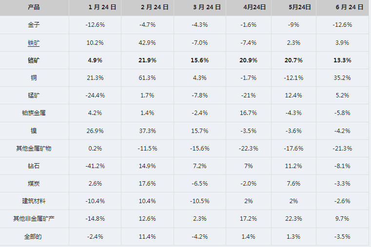 與此同時,鉻礦(13.3%vs 20.7%)和錳礦產量增長放緩(5.2%vs 12.4%)。相比之下,銅產量反彈(35.2%vs-12.1%)。