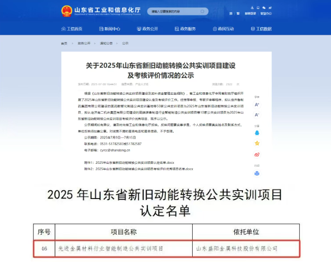 近日,山東省工業(yè)和信息化廳公示了《2025年山東省新舊動(dòng)能轉(zhuǎn)換公共實(shí)訓(xùn)項(xiàng)目認(rèn)定名單》,山東盛陽金屬科技以“先進(jìn)金屬材料行業(yè)智能制造公共實(shí)訓(xùn)項(xiàng)目”成功入選。