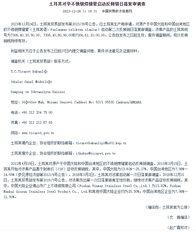 12月26日,據(jù)中國貿(mào)易救濟(jì)信息網(wǎng)一則公告《土耳其對華不銹鋼焊縫管啟動反傾銷日落復(fù)審調(diào)查》顯示,“2023年12月24日,土耳其貿(mào)易部發(fā)布第2023/39號公告,應(yīng)土耳其生產(chǎn)商申請,對原產(chǎn)于中國大陸和中國臺灣地區(qū)的不銹鋼焊縫管(土耳其語:Paslanmaz ?elikten olanlar)啟動第二次反傾銷日落復(fù)審調(diào)查。涉案產(chǎn)品的土耳其稅號為7306.40.20.90.00、7306.40.80.90.00和7306.61.10.00.00。公告自發(fā)布之日起生效,案件調(diào)查期間,現(xiàn)行反傾銷稅持續(xù)有效?!?/p>