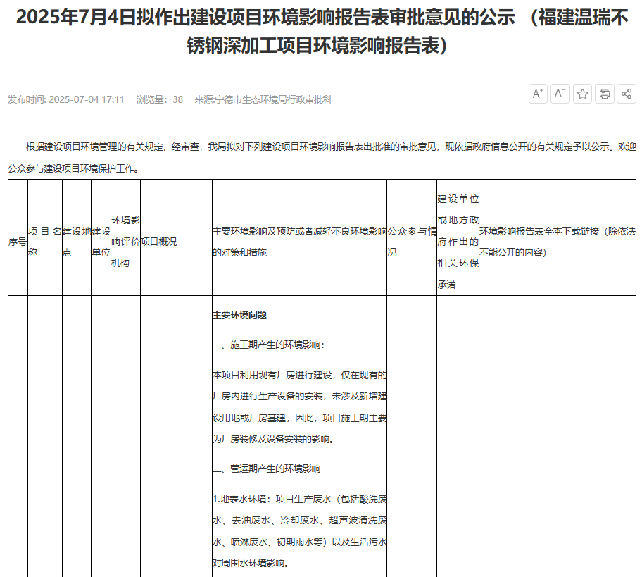 2025年7月4日,寧德市生態(tài)環(huán)境局就福建溫瑞管業(yè)科技有限公司不銹鋼深加工項目環(huán)境影響報告表作出審批意見并對外進行公示,公示時間:2025年7月4日-2025年7月11日(5個工作日)。