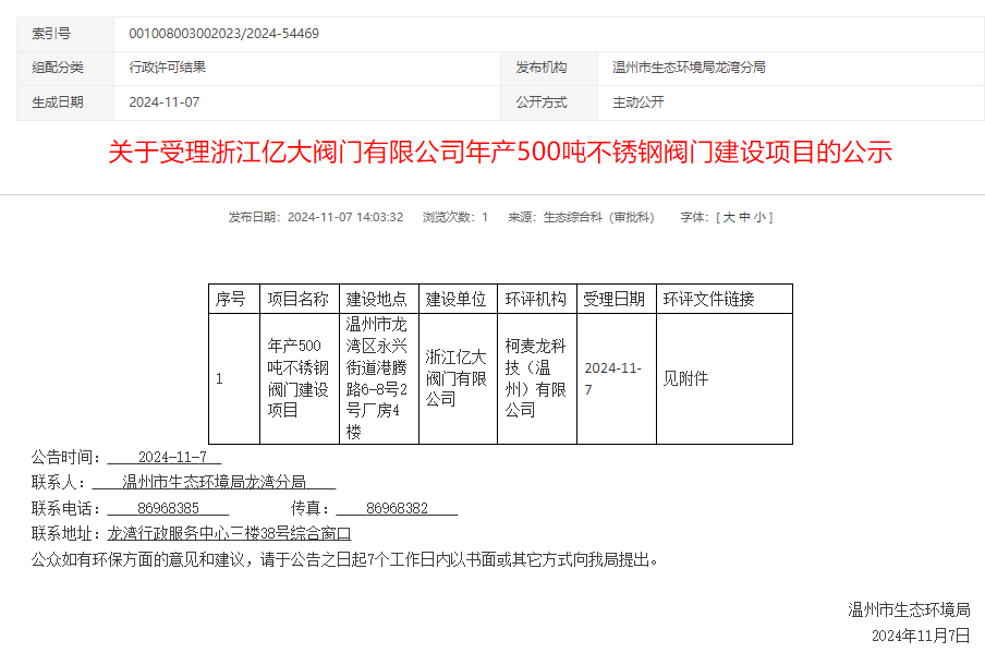2024年11月7日,溫州市生態(tài)環(huán)境局受理浙江億大閥門有限公司年產(chǎn)500噸不銹鋼閥門建設(shè)項目環(huán)境影響評價報告表并對外進行公示,公示期:7個工作日。