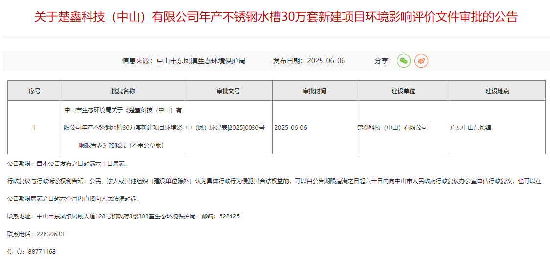 2025年6月6日,中山市東鳳鎮(zhèn)生態(tài)環(huán)境保護(hù)局就楚鑫科技(中山)有限公司年產(chǎn)不銹鋼水槽30萬(wàn)套新建項(xiàng)目環(huán)境影響報(bào)告表作出批復(fù)意見(jiàn)并對(duì)外進(jìn)行公告,公告期限:自本公告發(fā)布之日起滿六十日屆滿。