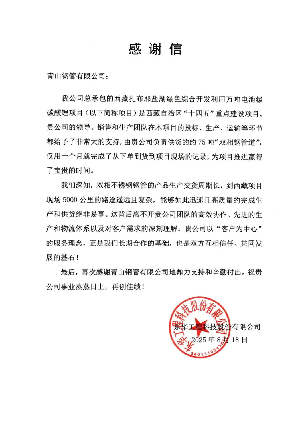 近日,青山鋼管有限公司收到東華工程科技股份有限公司發(fā)來(lái)的感謝信,對(duì)公司在西 藏扎布耶鹽湖綠色綜合開(kāi)發(fā)利用萬(wàn)噸電池級(jí)碳酸鋰項(xiàng)目中的卓越表現(xiàn)予以高度肯定。